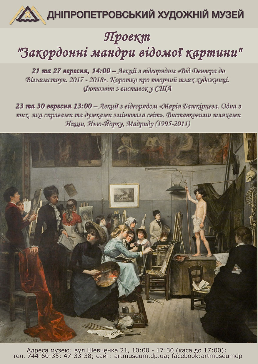 Днепропетровский художественный музей приглашает на мероприятия, посвященные настоящей жемчужине, одной из визиток не только музея, но и города Днепра. Это известная картина Марии Башкирцевой «В студии». «Возвращение путешественницы» является продолжением прошлогоднего проекта, который называется «Зарубежные путешествия известной картины» (сентябрь 2017).