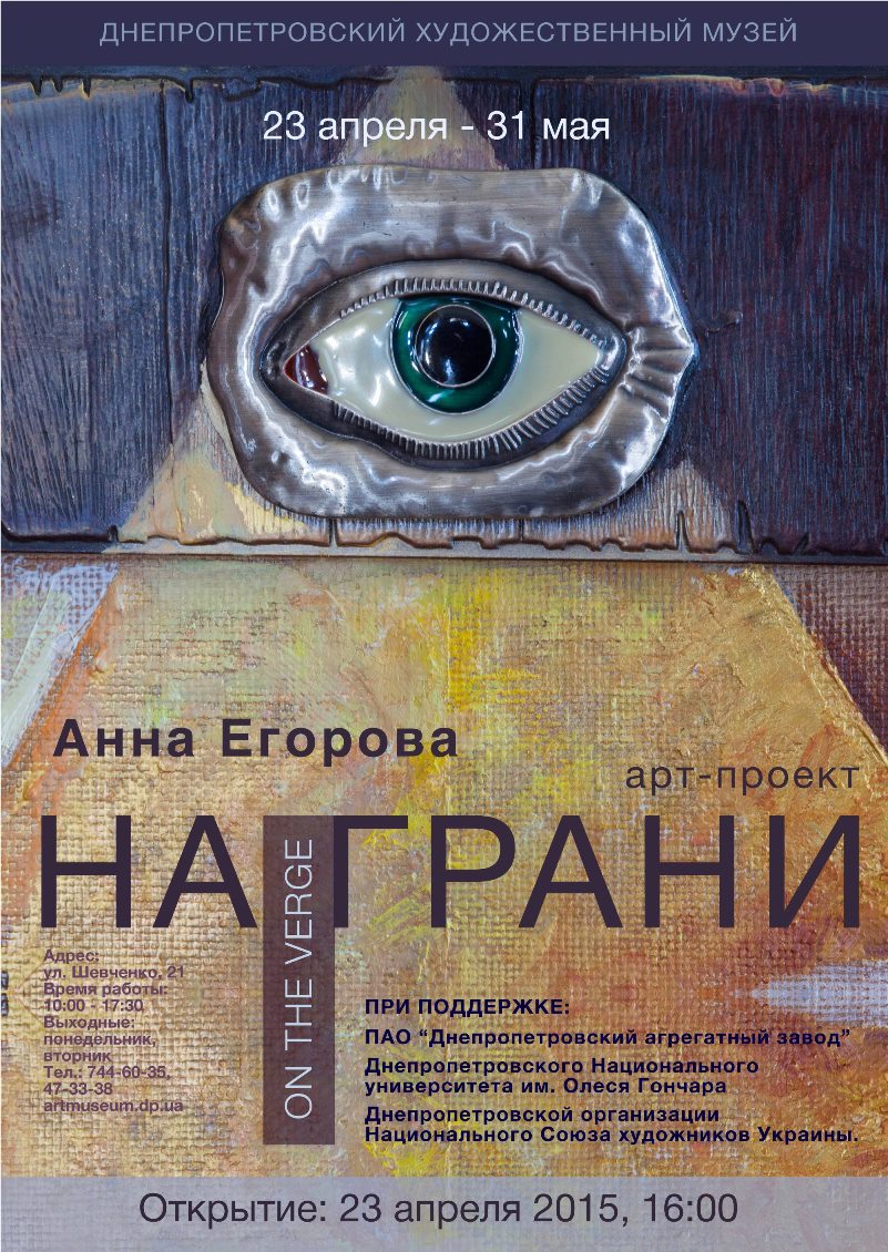 Ознайомитися з яскравою та нестандартною серією робіт Анни Єгорової «На грані» можна з 23 квітня по 31 травня 2015 року в залах Дніпропетровського художнього музею.