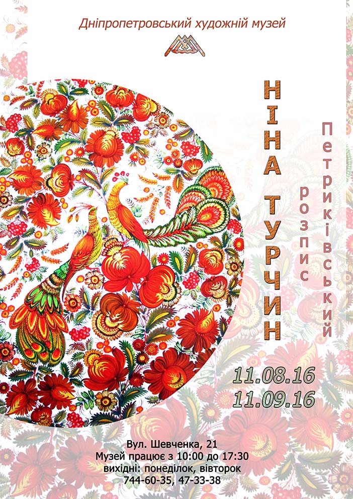 11 августа 2016 года в 16:00 в Днепропетровском художественном музее состоится открытие выставки произведений Нины Турчин – первой персональной выставки художницы, организованной по случаю 75-летия со дня еe рождения. Проект приурочен к 25-й годовщине Дня Независимости Украины.
