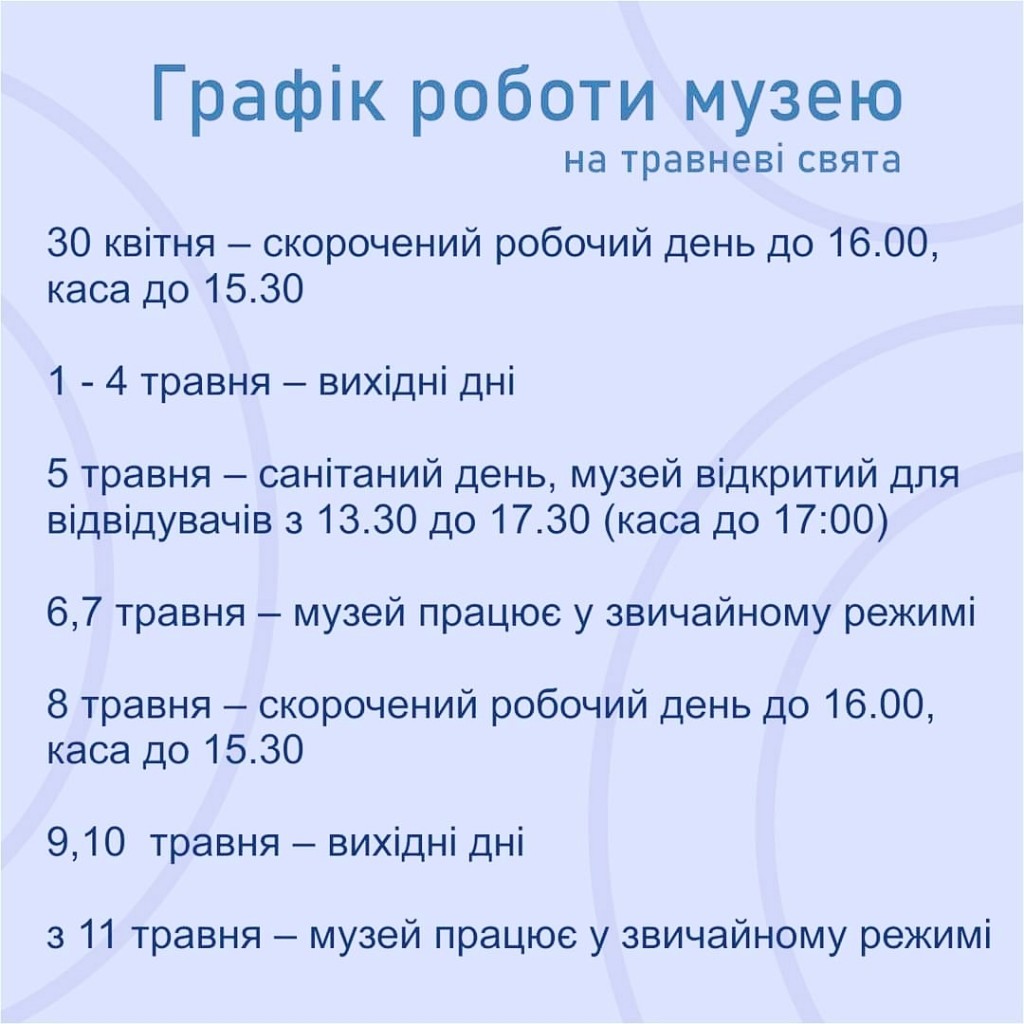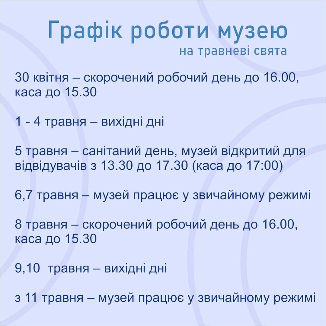 30 Квітня, 2021 Новини 0 Графік роботи Дніпропетровського художнього музею на травневі свята для відвідувачів. Графік роботи Дніпропетровського художнього музею на травневі свята для відвідувачів.