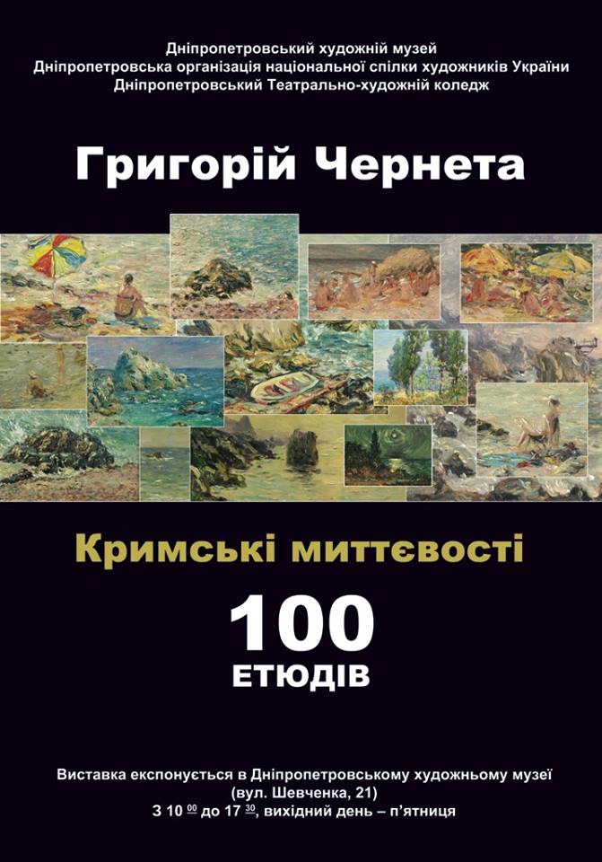 Творчество Григория Чернеты хорошо известно днепропетровскому зрителю. Его произведения экспонируются на всех областных,Дніпропетровський художній музей радий представити до уваги відвідувачів виставку творів заслуженого художника України Григорія Чернети «Кримські миттєвості. 100 етюдів»,