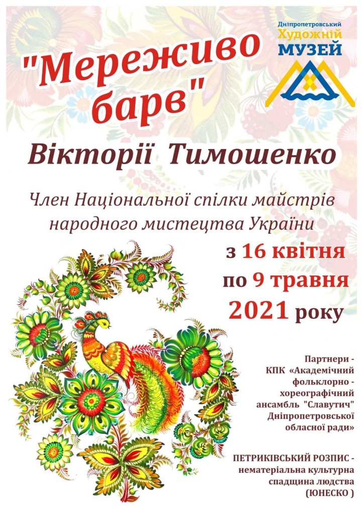 16 квітня 2021 р. у Дніпропетровському художньому музеї відкривається виставка «Мереживо барв», яка репрезентує майже 50 робіт української художниці, майстрині петриківського розпису Вікторії Тимошенко, мисткині з багаторічним стажем, членкині