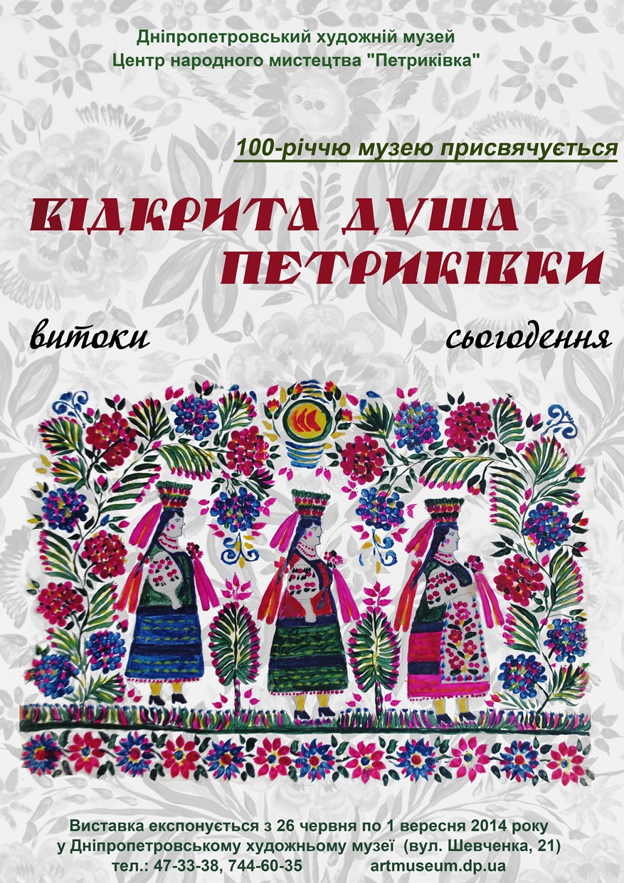 Виставка “Відкрита душа петриківки” – справжнє свято для гостей Дніпропетровського художнього музею, яке влаштували народні майстри у рік його столітнього ювілею. В експозиції на відвідувачів чекатимуть біля 100 творів декоративного розпису, котрі експонуватимуться вперше. Умовно виставка об`єднує дві гілки розвитку цього виняткового мистецтва – витоки та сьогодення.
