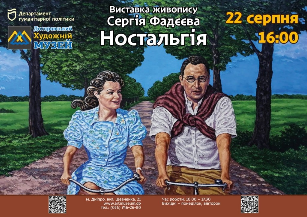 22 серпня о 16:00 в Дніпровському художньому музеї відбудеться відкриття виставки Сергія Фадєєва під назвою «Ностальгія». В експозиції представлено 19 жанрових картин, сюжети яких інколи перегукуються і перетікають з одного полотна на інше.