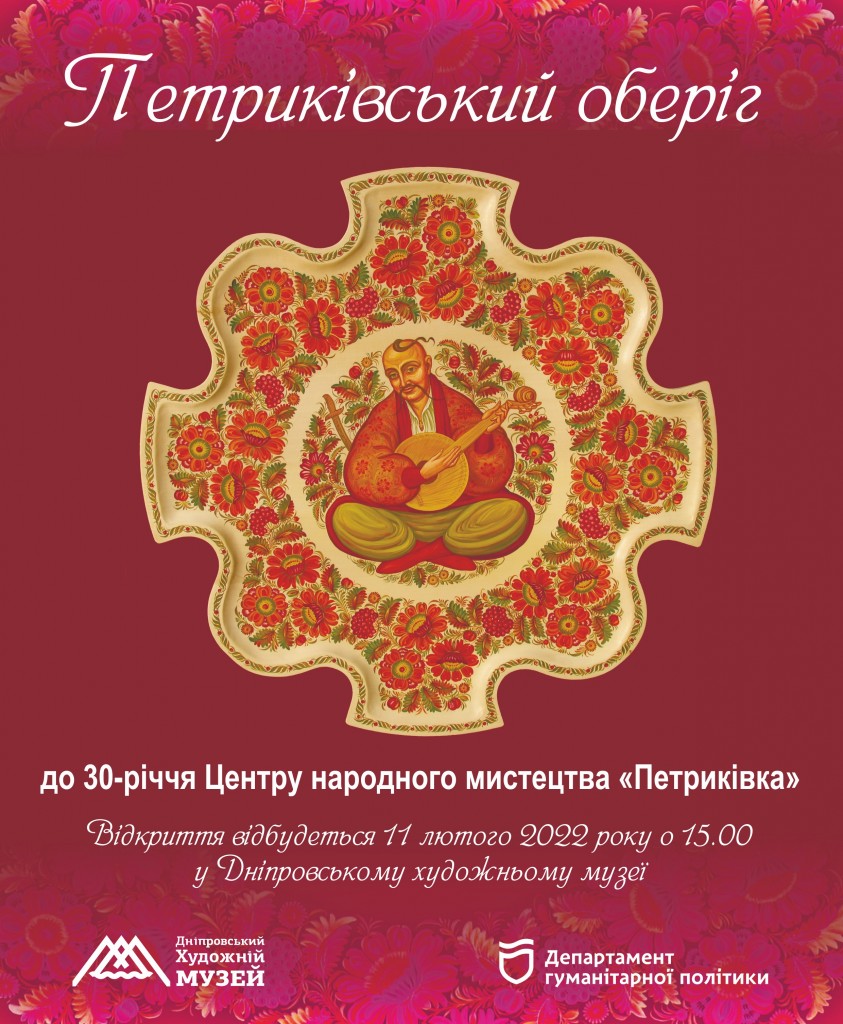 11 лютого 2022 року о 15.00 у виставкових залах Дніпровського художнього музею відбудетьсяВиставка творів петриківського декоративного розпису «ПЕТРИКІВСЬКИЙ ОБЕРІГ» до 30-річчя Центру народного мистецтва «Петриківка»