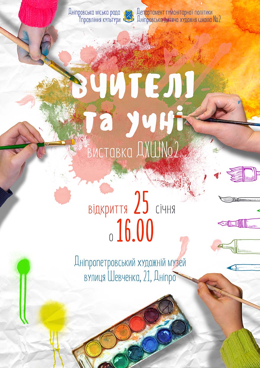 25 січня 2018 р. о 16.00 у виставковому залі Дніпропетровського художнього музею відбудеться відкриття виставки робіт викладачів та учнів Дніпровської художньої школи № 2 «Вчителі та учні».