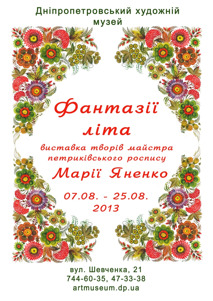 В экспозиции представлено около 100 произведений, выполненных в технике Петриковской росписи на различных материалах – бумага, холст, дерево.В Днепропетровском художественном музее проходит персональная выставка произведений мастера Петриковской росписи Марии Яненко.