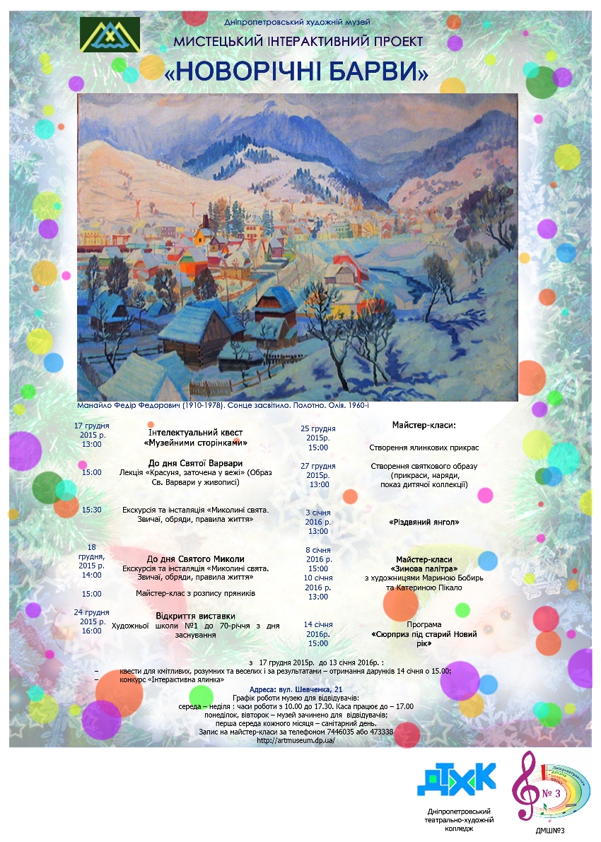 Днепропетровский художественный музей к новогодним и рождественским праздникам подготовил программу проекта, которая представит новые интерактивные экскурсии-игры, праздничные мастер-классы, выставку детского рисунка от ДЮК «Веснянка» и новый годовой проект «Экспонат месяца».