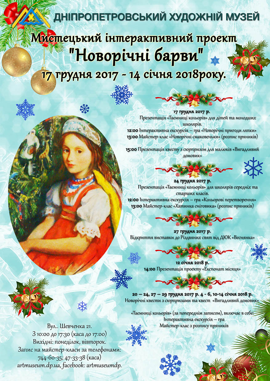 Дніпропетровський художній музей до  новорічних та різдвяних свят підготував програму проекту, яка презентуватиме нові інтерактивні екскурсії-ігри, святкові майстер-класи, виставку дитячого малюнку від ДЮК «Веснянка» та новий річний проект «Експонат місяця».