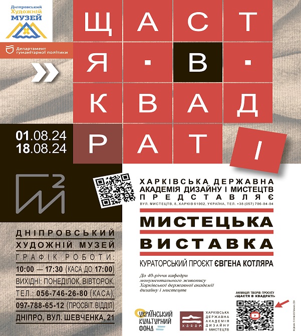 Раді повідомити, що з 1 серпня у Дніпровському художньому музеї діє мистецька виставка «ЩАСТЯ В КВАДРАТІ»
