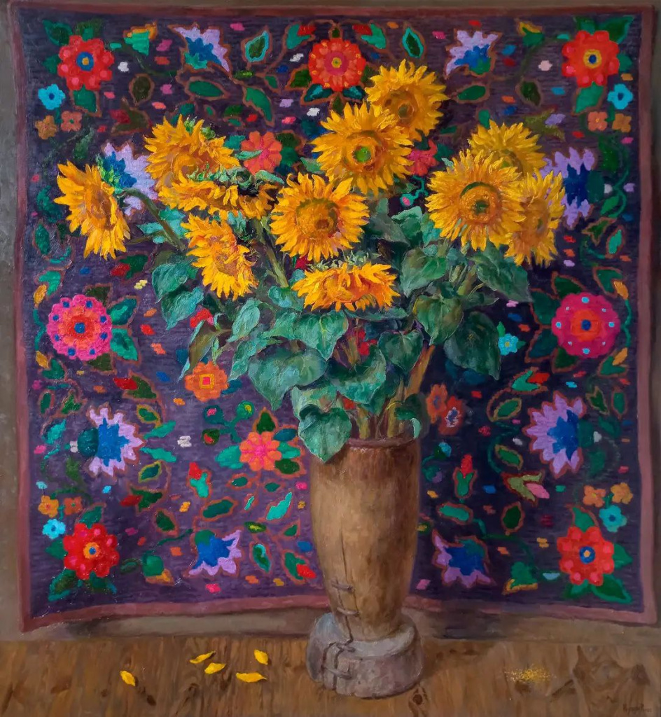 • Me gusta la obra “Girasoles en un decorado campestre” año 2022 porque es forma en que el autor combina la belleza de las flores y las notas del pueblo ucraniano.Los girasoles son un símbolo de felicidad, optimismo y vitalidad. La pintura me da una sensación de alegría y positividad.