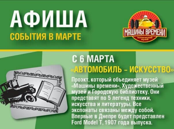 6 марта 2018 стартует ТЕХНИКО-ХУДОЖЕСТВЕННЫЙ ВЫСТАВОЧНЫЙ ПРОЕКТ Музея «Машины времени» в партнерстве с Днепропетровским художественным музеем и Городской центральной библиотекой.