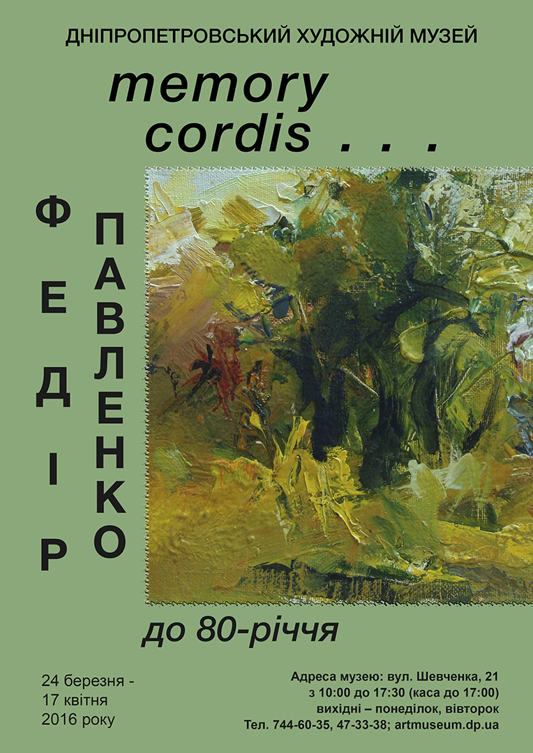 24 марта 2016 года в 16:00 в Днепропетровском художественном музее состоится открытие выставки памяти художника Федора Павленка (1936-2008), которая посвящена 80-летию со дня рождения художника.