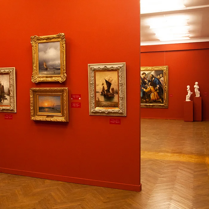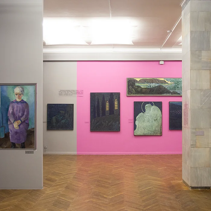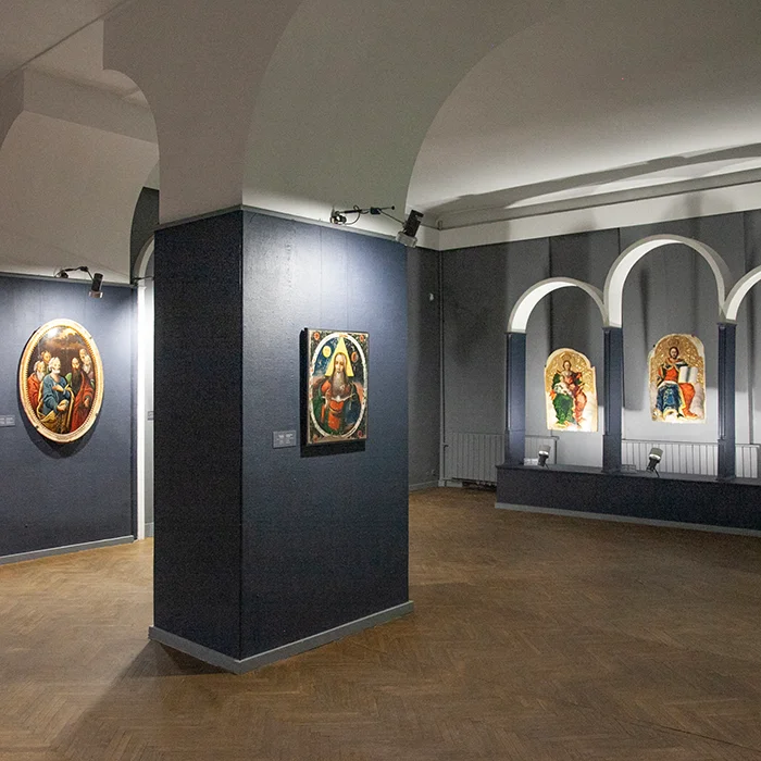 Основна експозиція музею відкривається залою українського сакрального мистецтва XVIII – початку XIX століття, яку як повноцінну частину постійної експозиції почали демонструвати лише з другої половини 1980-х років. Сучасного вигляду зала набула влітку 2021 року з акцентом на мистецтві Придніпров’я. Основу колекції становлять пам’ятки зі зібрання Д.І. Яворницького, зокрема ікони «Богоматір “Нев’янучий Цвіт”», «Христос “Цар Небесний”», «Іоанн Богослов», що походять з іконостаса Свято-Миколаївського собору села Куцеволівка та є зразками українського бароко. В експозиції представлені також різьблені оздоби і твори майстра Сисоя Шалматова, стародруки й сакральні атрибути. Перлиною збірки є вінчальна пара — «Христос Вседержитель» і «Богоматір з немовлям», написані козацьким богомазом та оздоблені характерним квітковим орнаментом Придніпров’я.