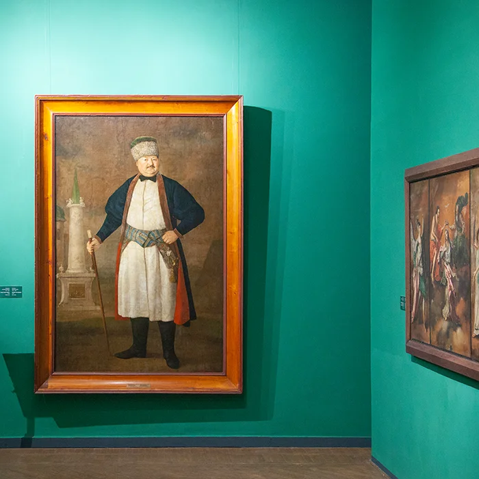 Музейна колекція українських портретів XVII – початку XIX століття представлена переважно творами придніпровського походження. Значну частину з них музей отримав завдяки діяльності Дмитра Яворницького, який залучив портрети з приватних зібрань місцевих колекціонерів і козацько-старшинських родин. В експозиції демонструються вісім портретів безіменних українських майстрів. Серед них — ктиторські та епітафіальні зображення, зокрема «Портрет гетьмана Івана Мазепи», «Портрет сотника Василя Родзянка» та «Портрет єпископа Йоасафа». Для цих творів характерні урочистість, парадні костюми та меморіальний зміст. Поряд із ними представлені світські та «статусні» портрети гетьманів Івана Скоропадського й Івана Самойловича. Особливе місце посідає «Портрет Павла Руденка» роботи Володимира Боровиковського, що поєднує традиції українського та західноєвропейського живопису.