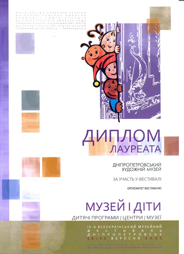 Всеукраїнському музейному фестивалі «Музей і діти: дитячі програми, центри, музеї», який відбувався на базі Дніпропетровського національного історичного музею імені Д.І. Яворницького. На розгляд журі фестивалю були представлені роботи понад 80 музеїв України.